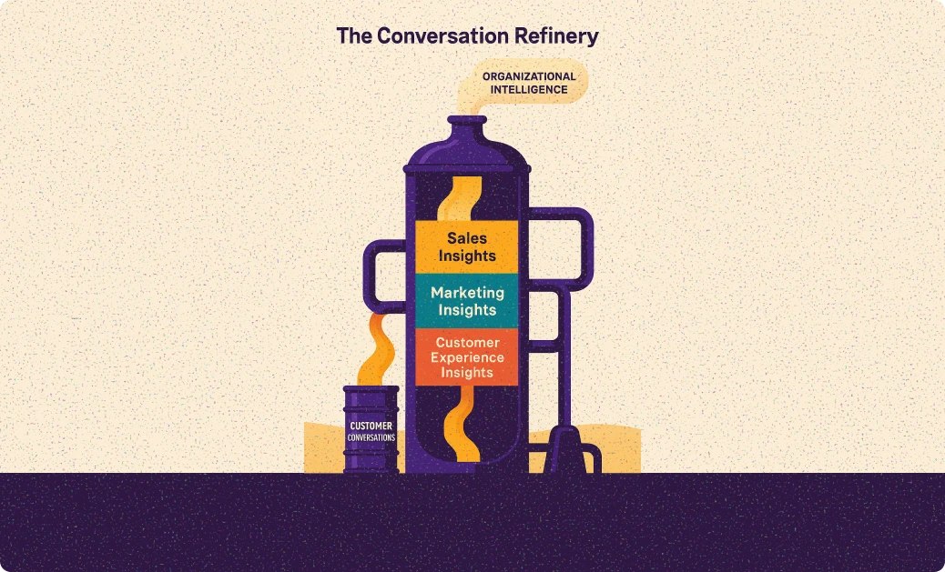 Today, most organizations are wildcatters. They’re drilling thousands of customer conversations (sales calls, support tickets, customer interviews, onboarding sessions) and storing them in barrels. Some play them back occasionally. Most sit untouched in digital warehouses, a vast reserve of raw material that never gets refined.